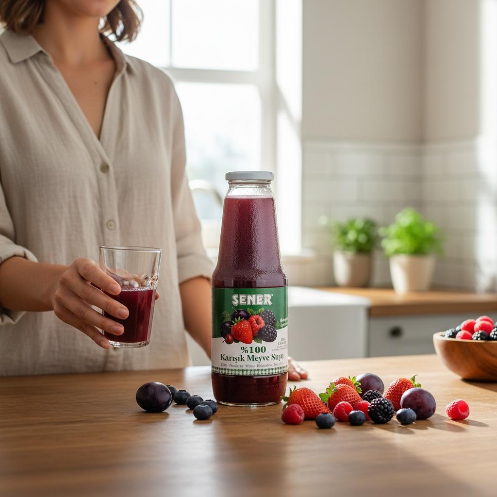 Şener %100 Karışık Meyve Suyu; çilek, ahududu, vişne, böğürtlen ve kara erik gibi özenle seçilmiş meyvelerin hiçbir katkı maddesi eklenmeden bir araya gelmesiyle hazırlanmıştır. İlave şeker, aroma, renklendirici ve koruyucu içermez. Sadece meyvenin kendi doğal tadı ve rengiyle sofralarınıza ulaşır.